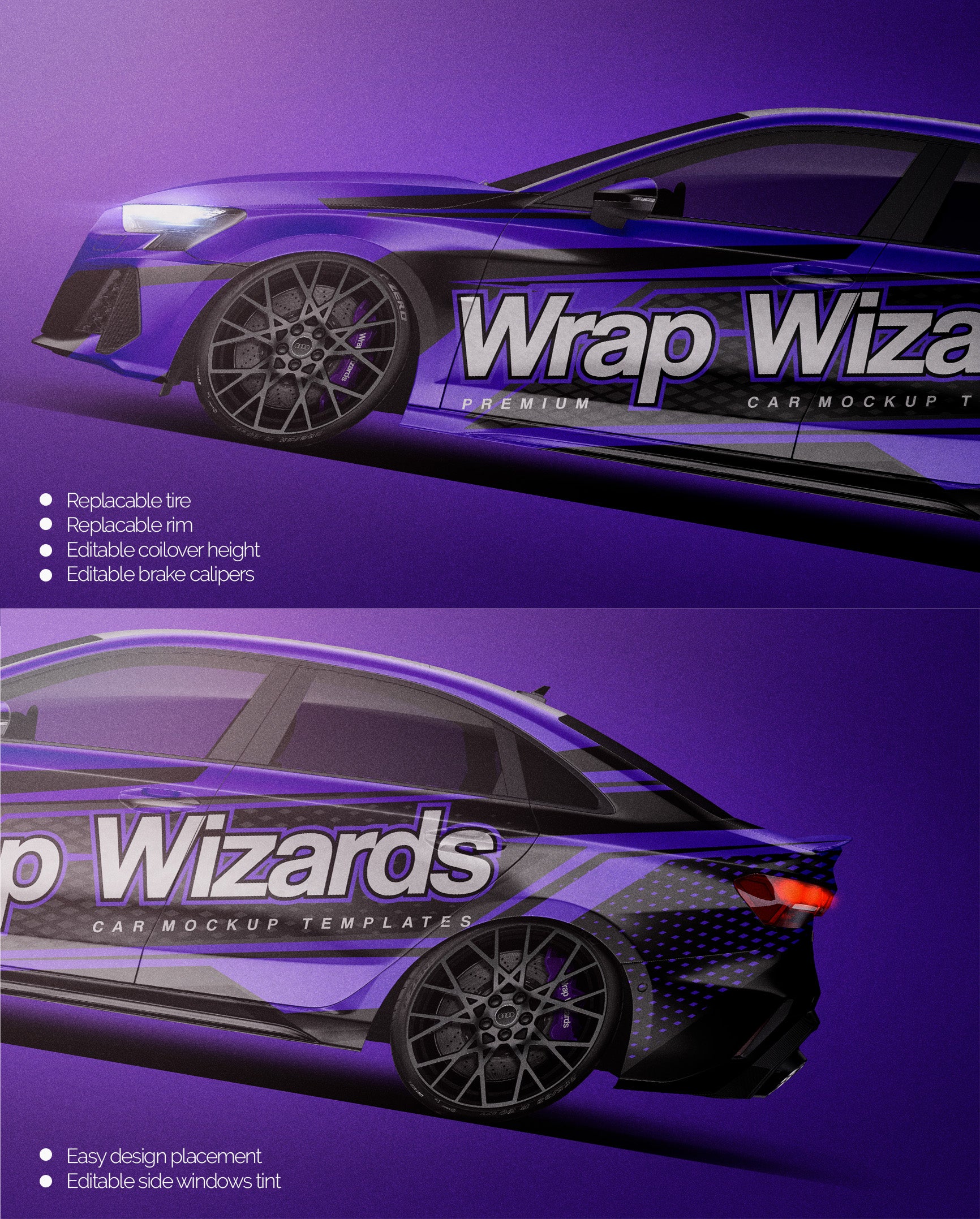 The templates are made on smartly and usefully separated layers to make adding design parts, custom color, placing logos or stickers and doing all adjustments as suspension height or rims change as easy and quick as possible - because we want to improve your job and save your time!