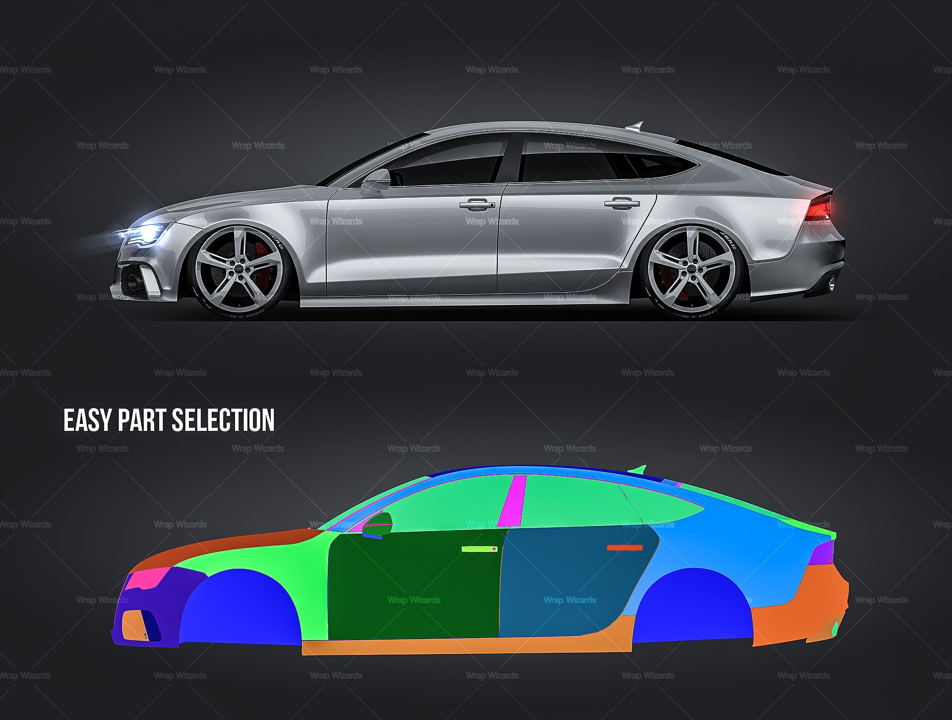 The templates are made on smartly and usefully separated layers to make adding design parts, custom color, placing logos or stickers and doing all adjustments as suspension height or rims change as easy and quick as possible - because we want to improve your job and save your time!