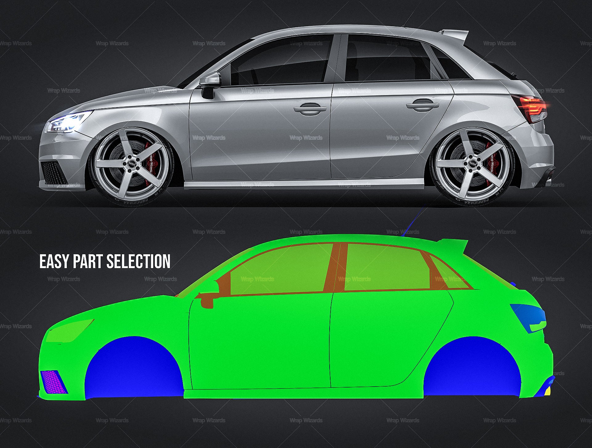 The templates are made on smartly and usefully separated layers to make adding design parts, custom color, placing logos or stickers and doing all adjustments as suspension height or rims change as easy and quick as possible - because we want to improve your job and save your time!