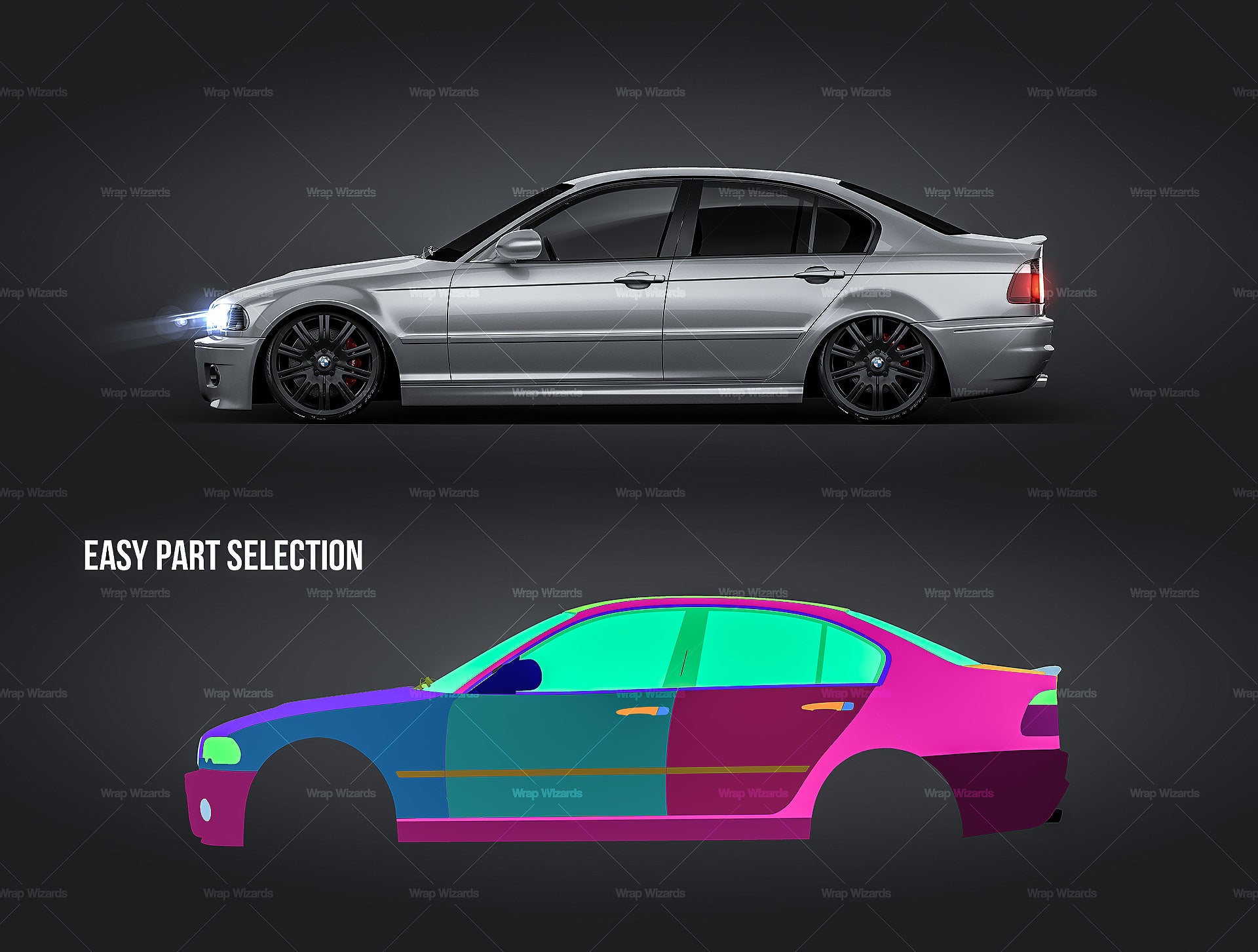 The templates are made on smartly and usefully separated layers to make adding design parts, custom color, placing logos or stickers and doing all adjustments as suspension height or rims change as easy and quick as possible - because we want to improve your job and save your time!