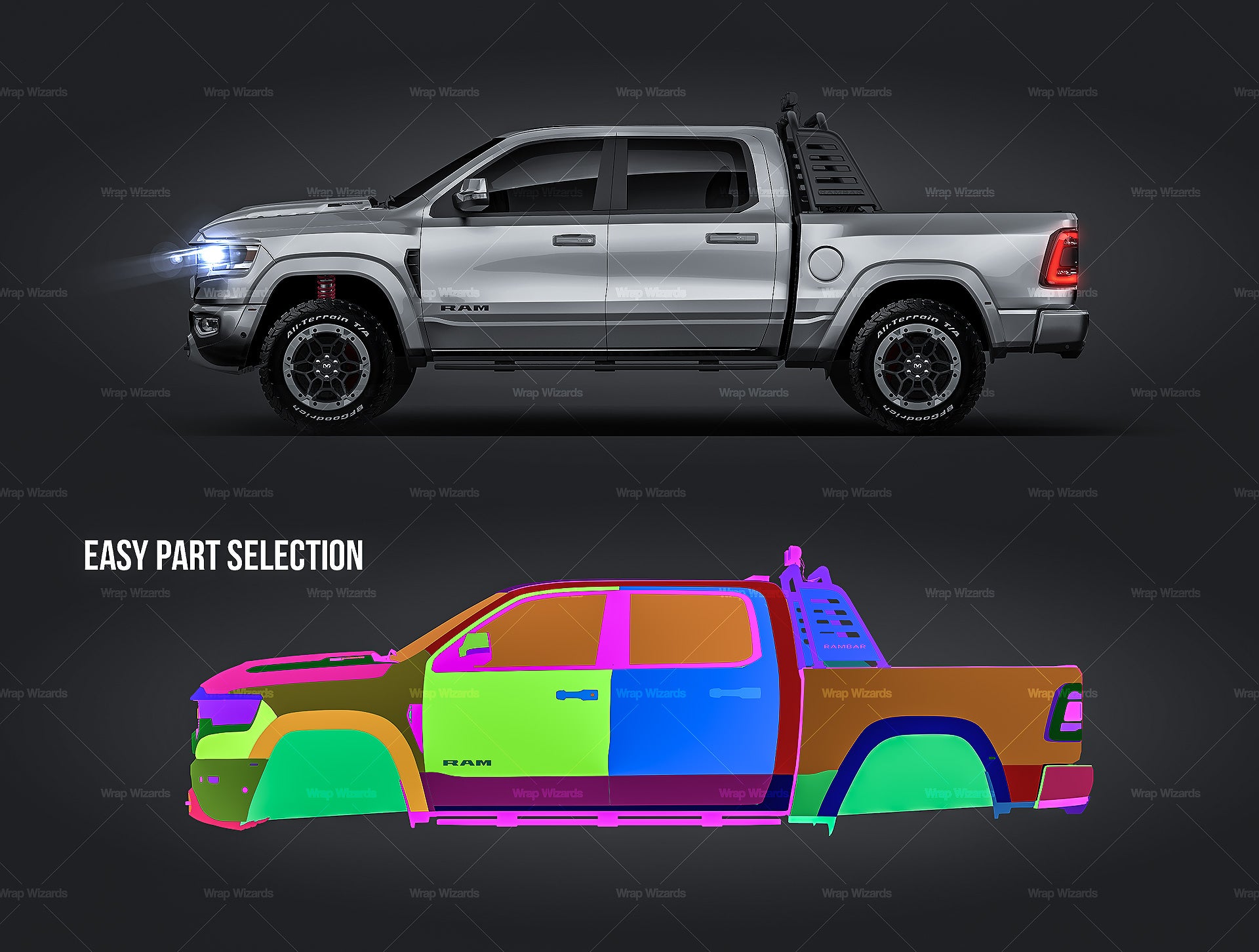 The templates are made on smartly and usefully separated layers to make adding design parts, custom color, placing logos or stickers and doing all adjustments as suspension height or rims change as easy and quick as possible - because we want to improve your job and save your time!
