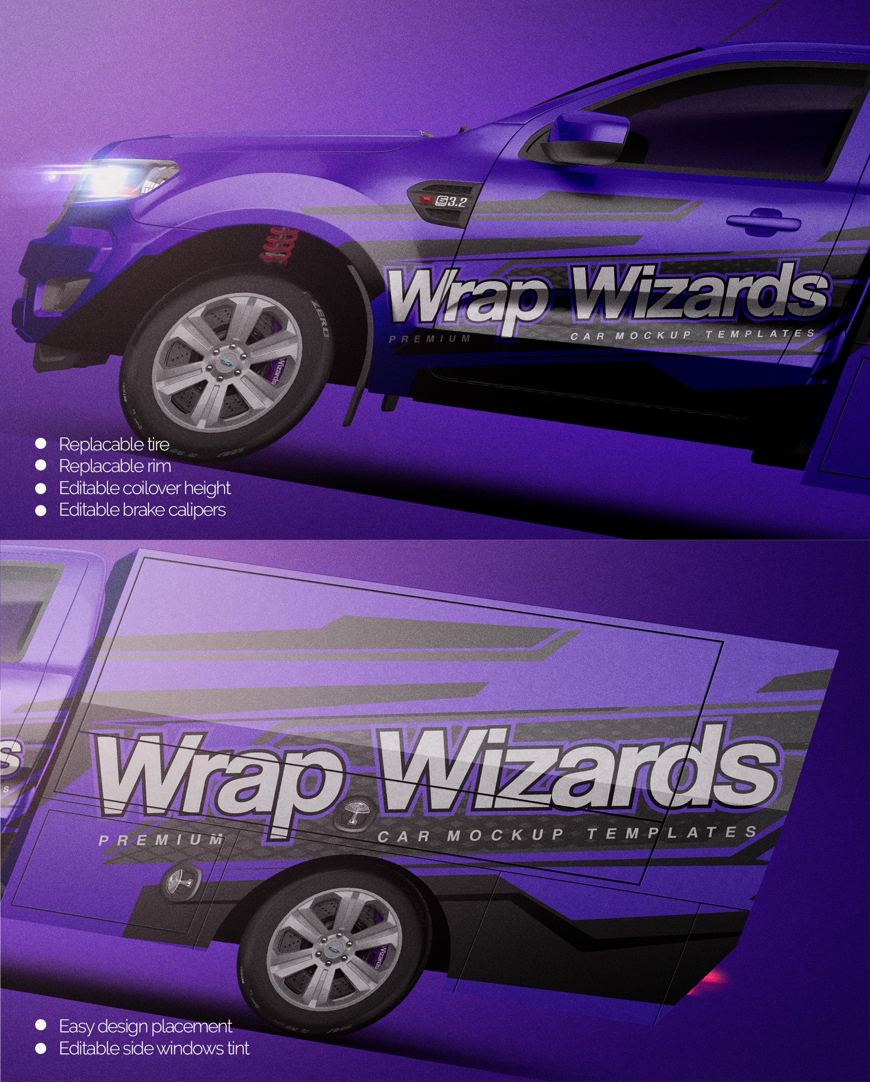 The templates are made on smartly and usefully separated layers to make adding design parts, custom color, placing logos or stickers and doing all adjustments as suspension height or rims change as easy and quick as possible - because we want to improve your job and save your time!
