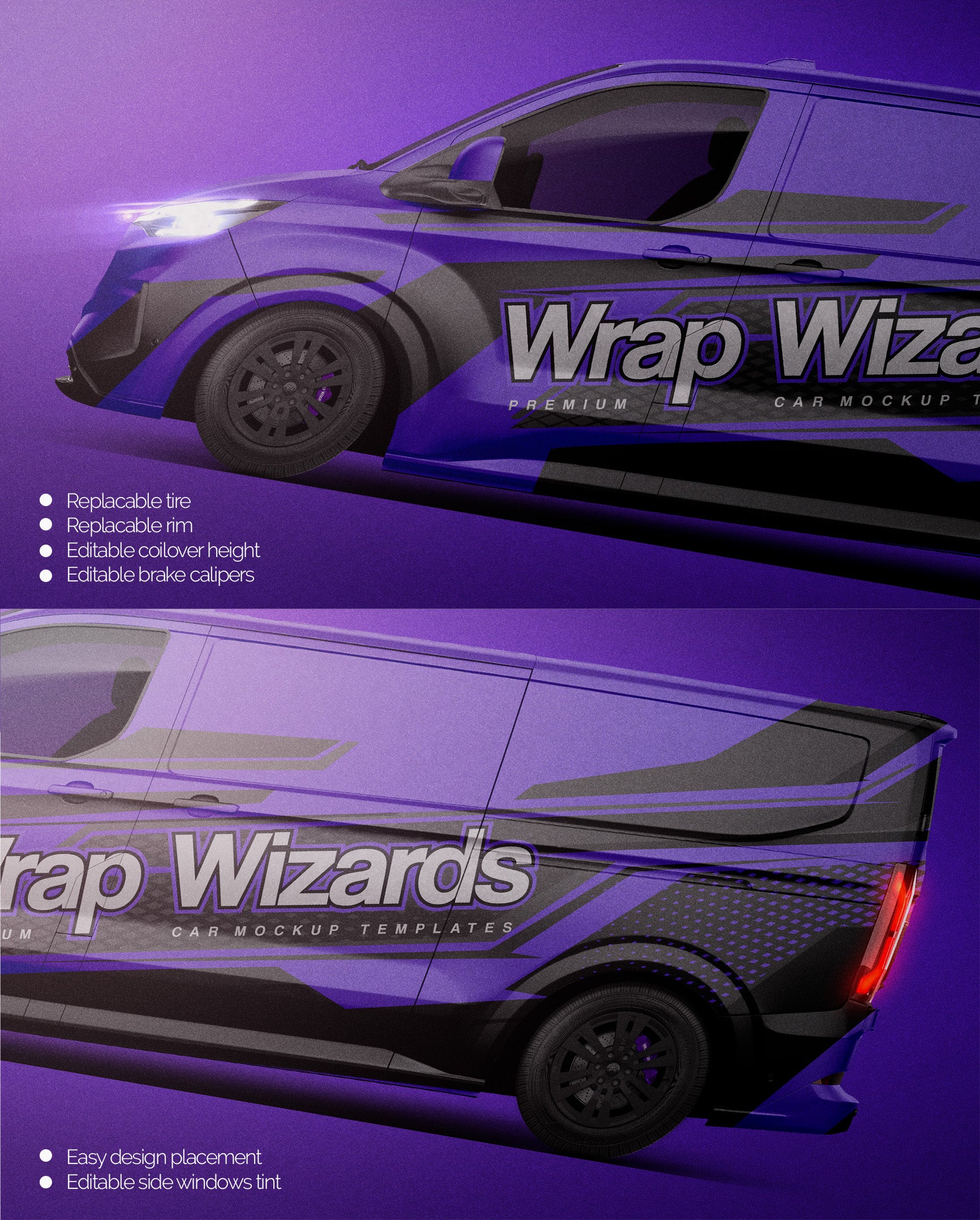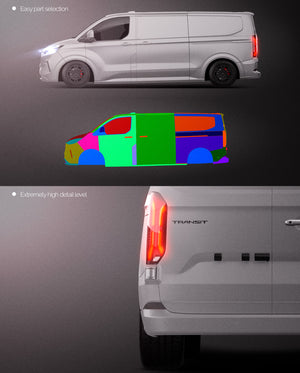 The templates are made on smartly and usefully separated layers to make adding design parts, custom color, placing logos or stickers and doing all adjustments as suspension height or rims change as easy and quick as possible - because we want to improve your job and save your time!