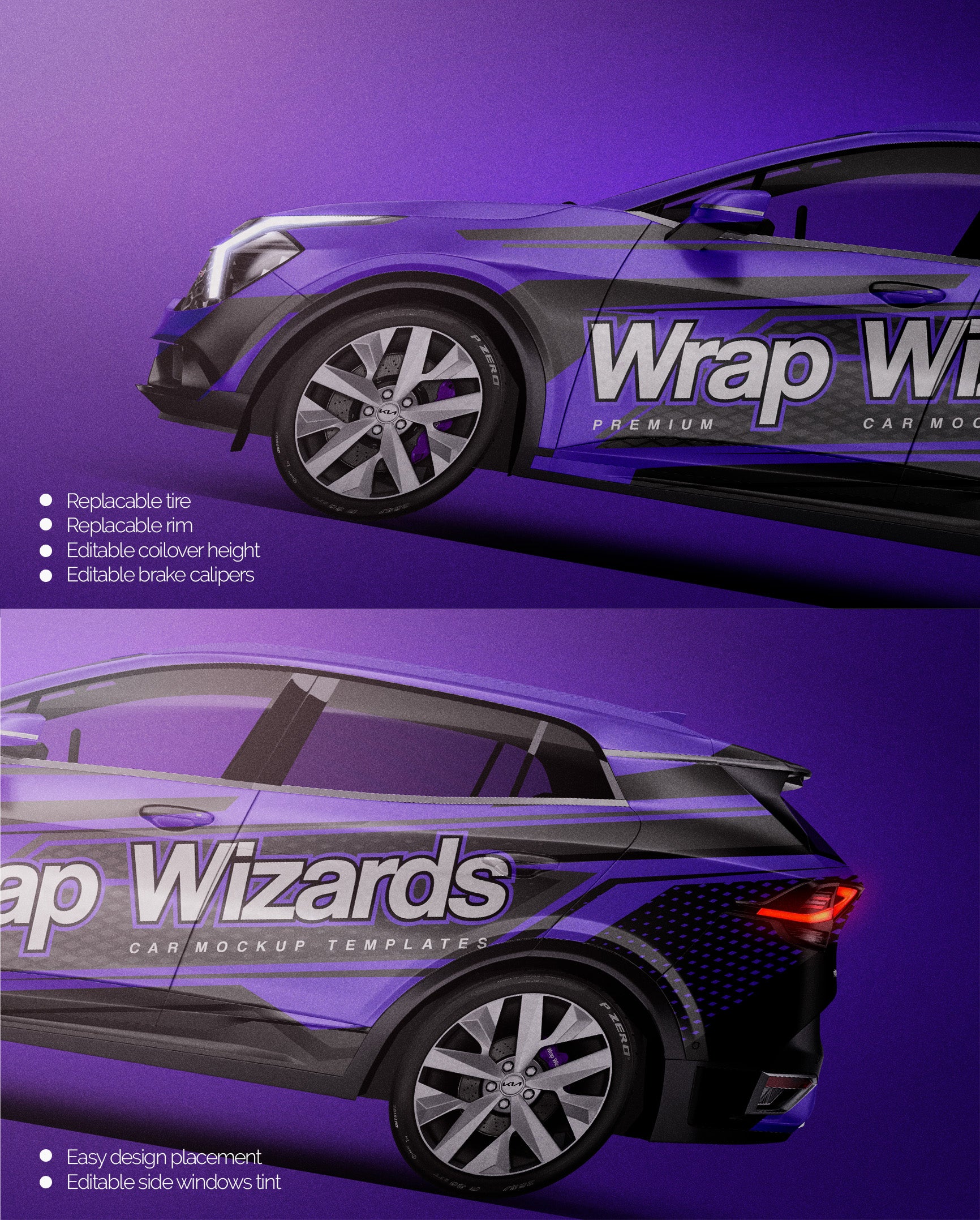 The templates are made on smartly and usefully separated layers to make adding design parts, custom color, placing logos or stickers and doing all adjustments as suspension height or rims change as easy and quick as possible - because we want to improve your job and save your time!