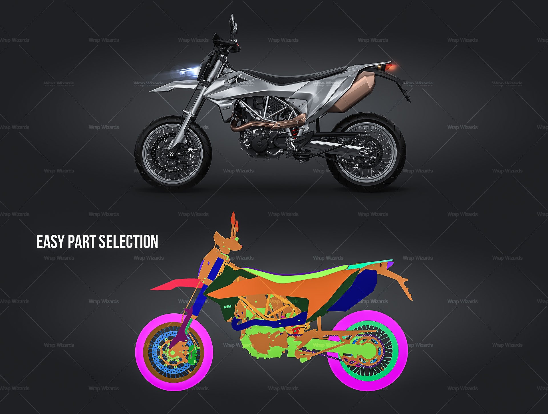 The templates are made on smartly and usefully separated layers to make adding design parts, custom color, placing logos or stickers and doing all adjustments as suspension height or rims change as easy and quick as possible - because we want to improve your job and save your time!
