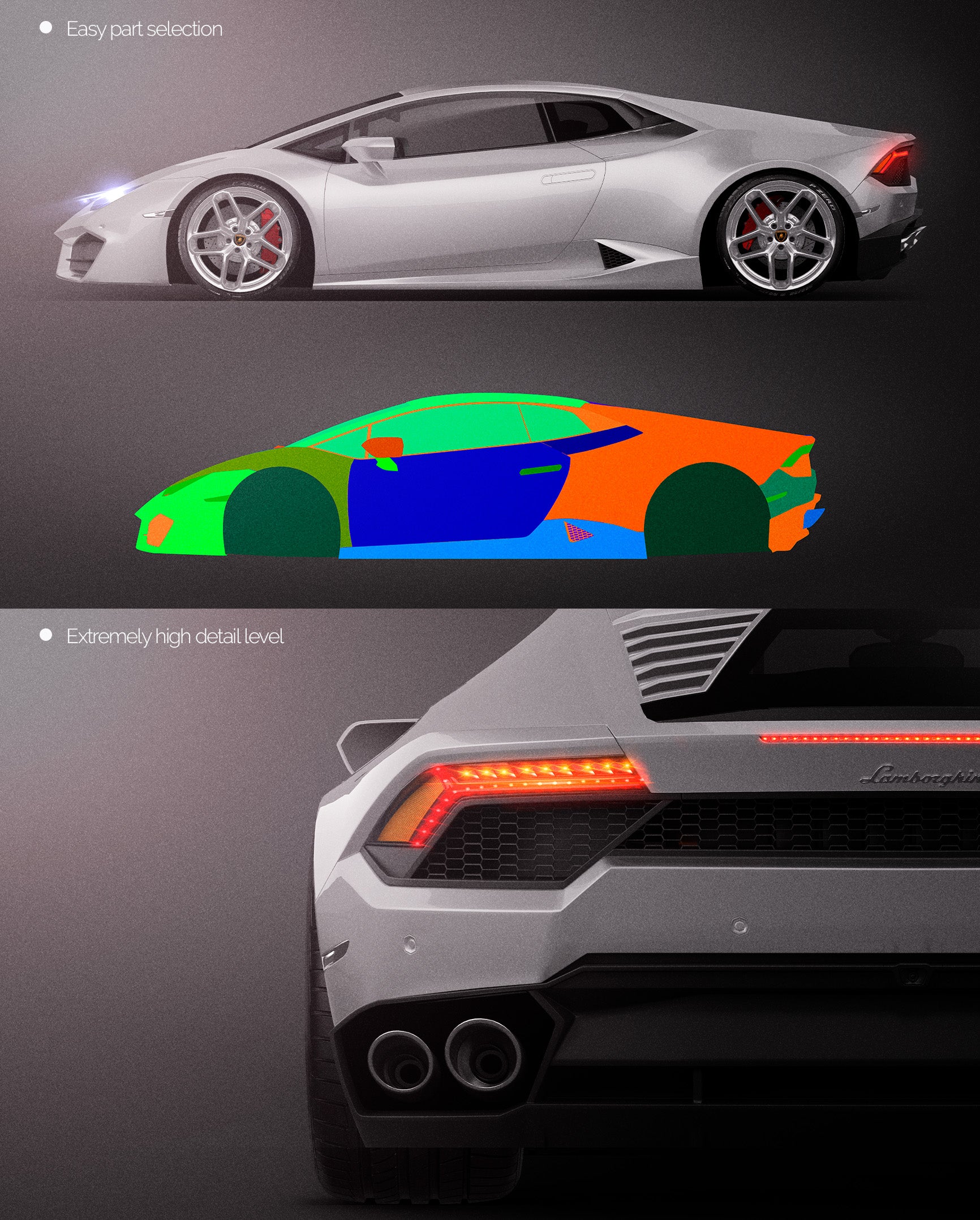 The templates are made on smartly and usefully separated layers to make adding design parts, custom color, placing logos or stickers and doing all adjustments as suspension height or rims change as easy and quick as possible - because we want to improve your job and save your time!