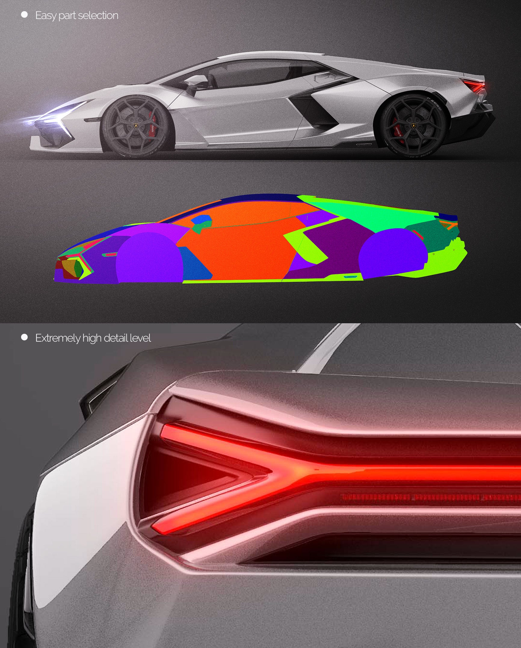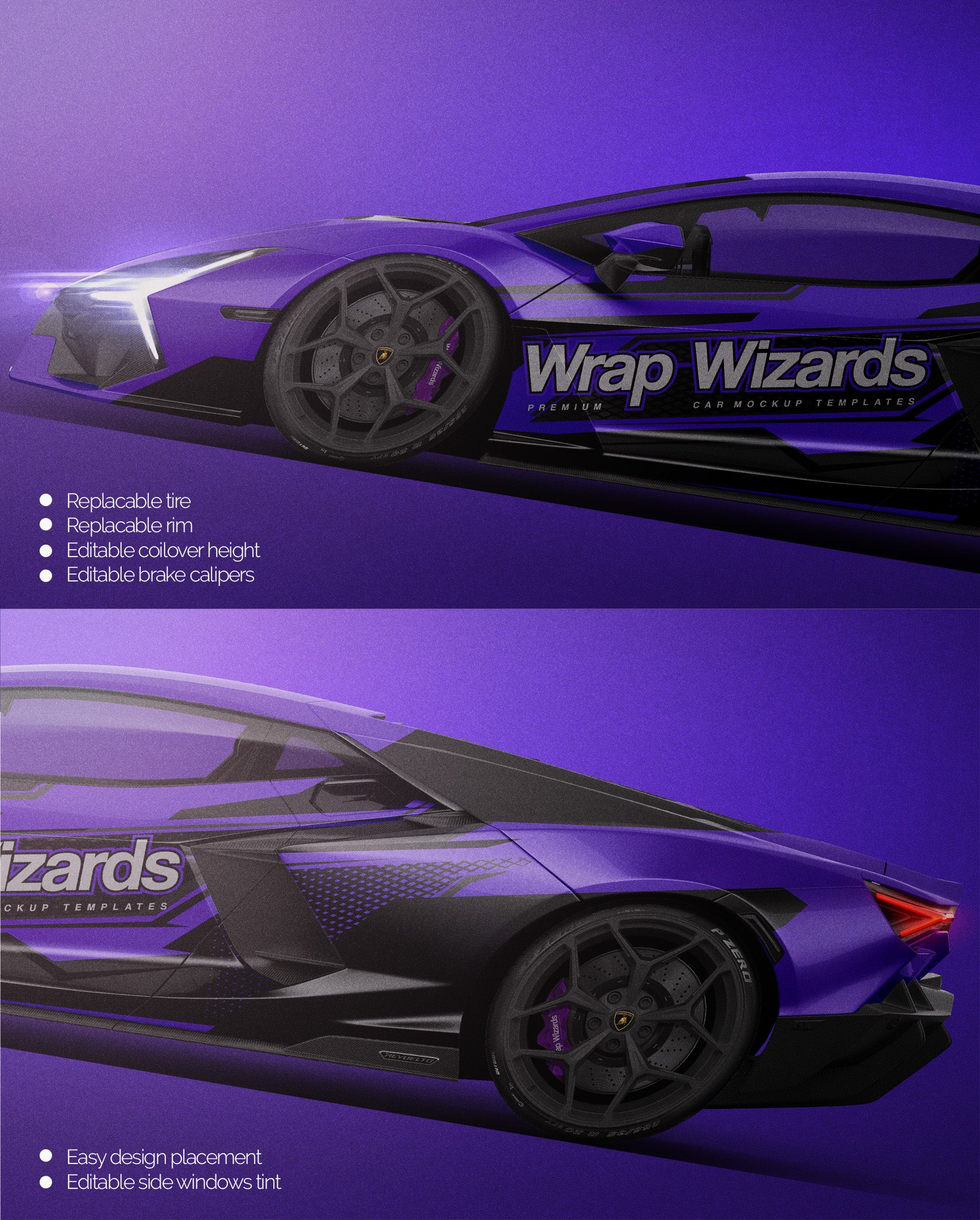 The templates are made on smartly and usefully separated layers to make adding design parts, custom color, placing logos or stickers and doing all adjustments as suspension height or rims change as easy and quick as possible - because we want to improve your job and save your time!