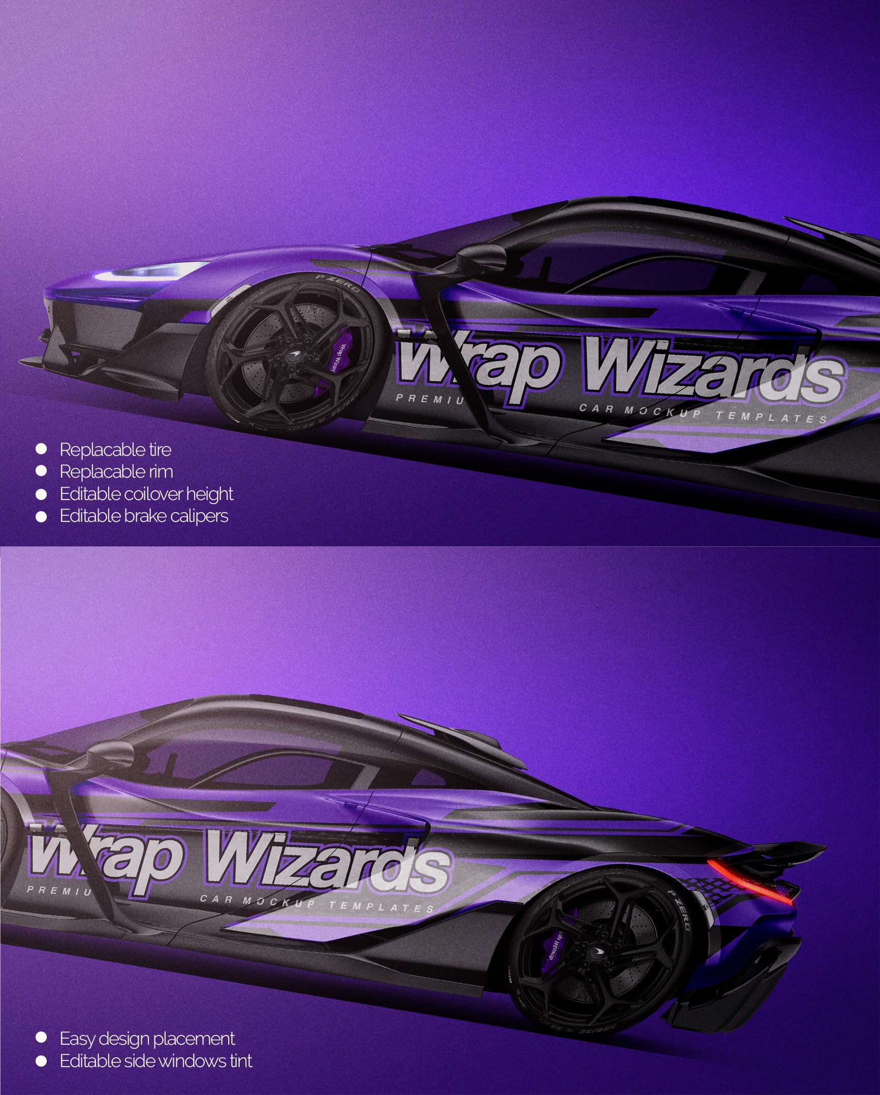 The templates are made on smartly and usefully separated layers to make adding design parts, custom color, placing logos or stickers and doing all adjustments as suspension height or rims change as easy and quick as possible - because we want to improve your job and save your time!