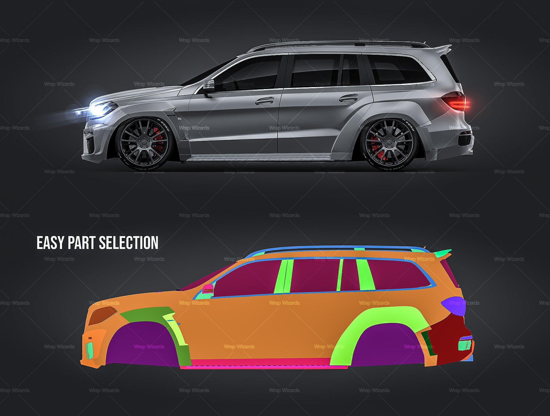 The templates are made on smartly and usefully separated layers to make adding design parts, custom color, placing logos or stickers and doing all adjustments as suspension height or rims change as easy and quick as possible - because we want to improve your job and save your time!