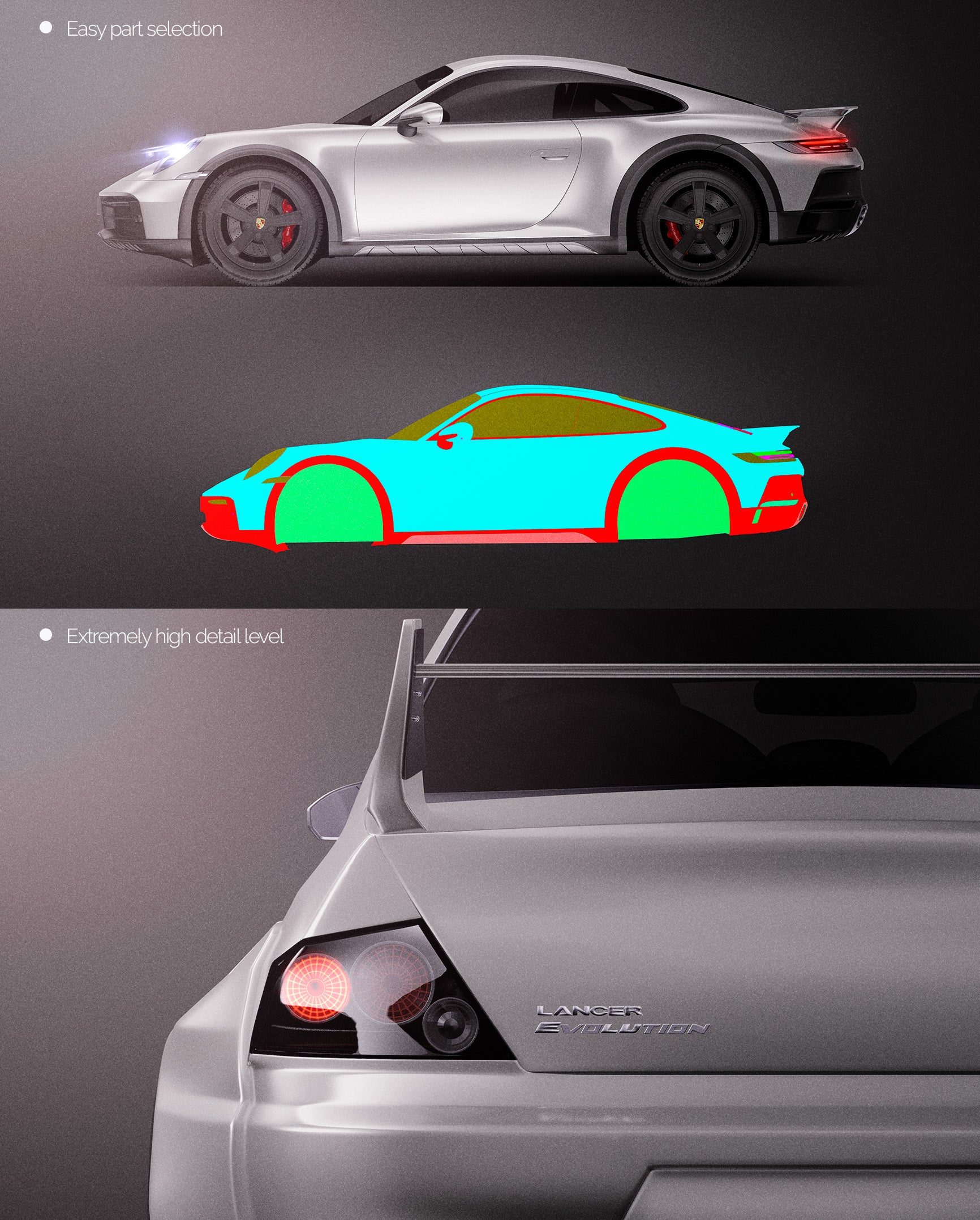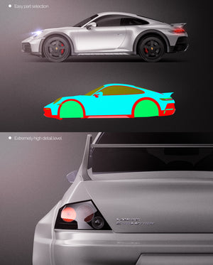 The templates are made on smartly and usefully separated layers to make adding design parts, custom color, placing logos or stickers and doing all adjustments as suspension height or rims change as easy and quick as possible - because we want to improve your job and save your time!