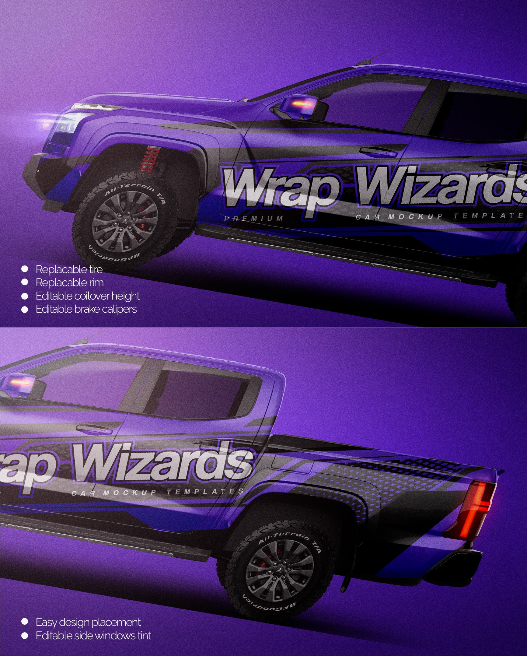 The templates are made on smartly and usefully separated layers to make adding design parts, custom color, placing logos or stickers and doing all adjustments as suspension height or rims change as easy and quick as possible - because we want to improve your job and save your time!
