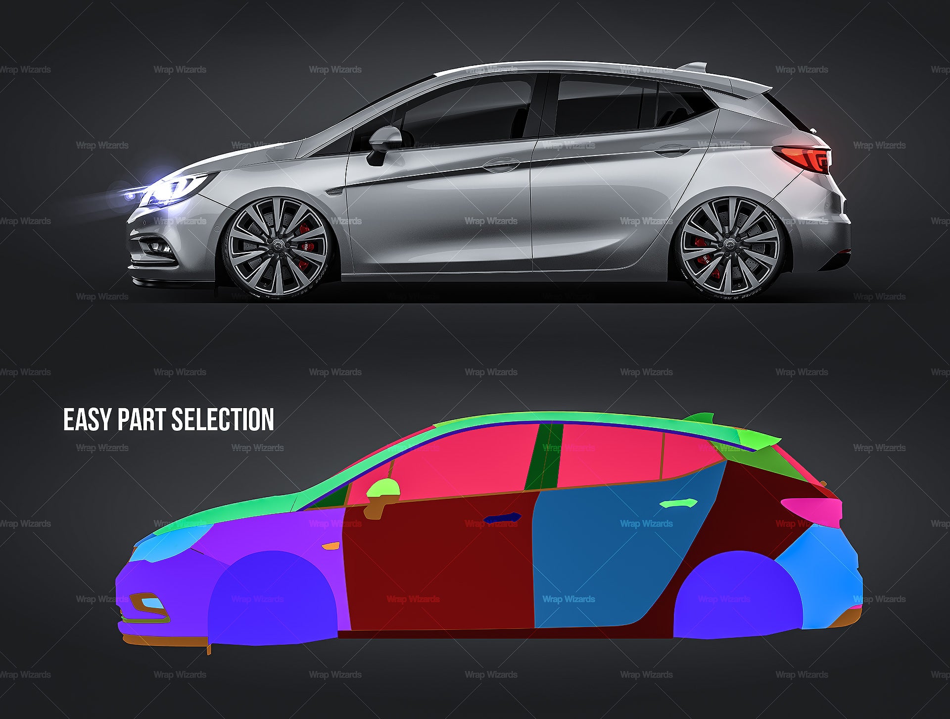 The templates are made on smartly and usefully separated layers to make adding design parts, custom color, placing logos or stickers and doing all adjustments as suspension height or rims change as easy and quick as possible - because we want to improve your job and save your time!