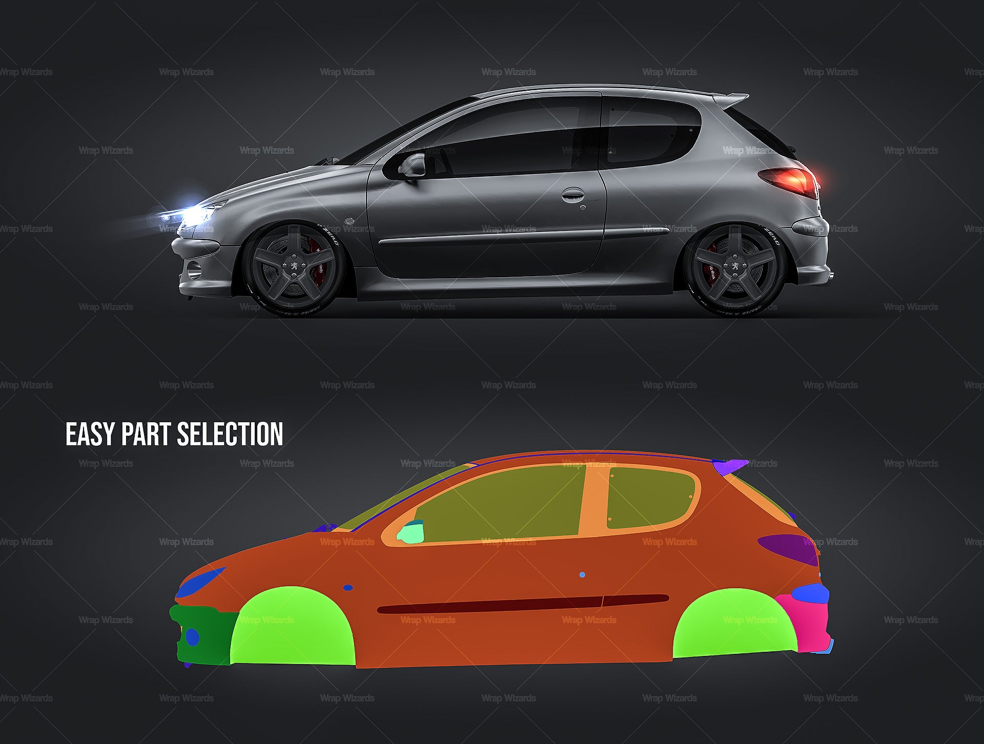 The templates are made on smartly and usefully separated layers to make adding design parts, custom color, placing logos or stickers and doing all adjustments as suspension height or rims change as easy and quick as possible - because we want to improve your job and save your time!