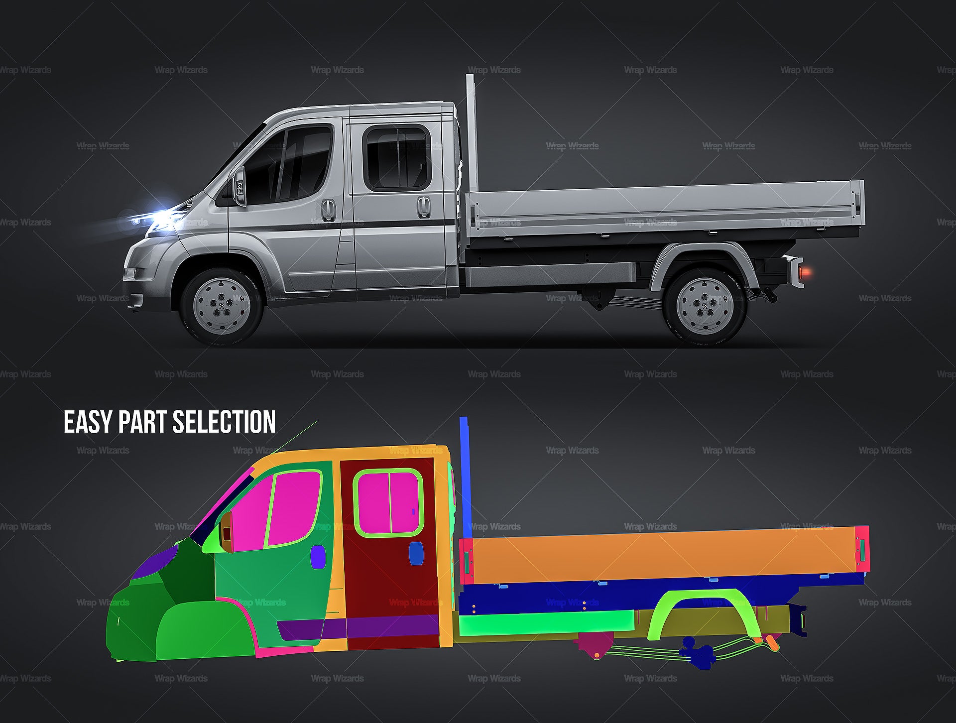 The templates are made on smartly and usefully separated layers to make adding design parts, custom color, placing logos or stickers and doing all adjustments as suspension height or rims change as easy and quick as possible - because we want to improve your job and save your time!