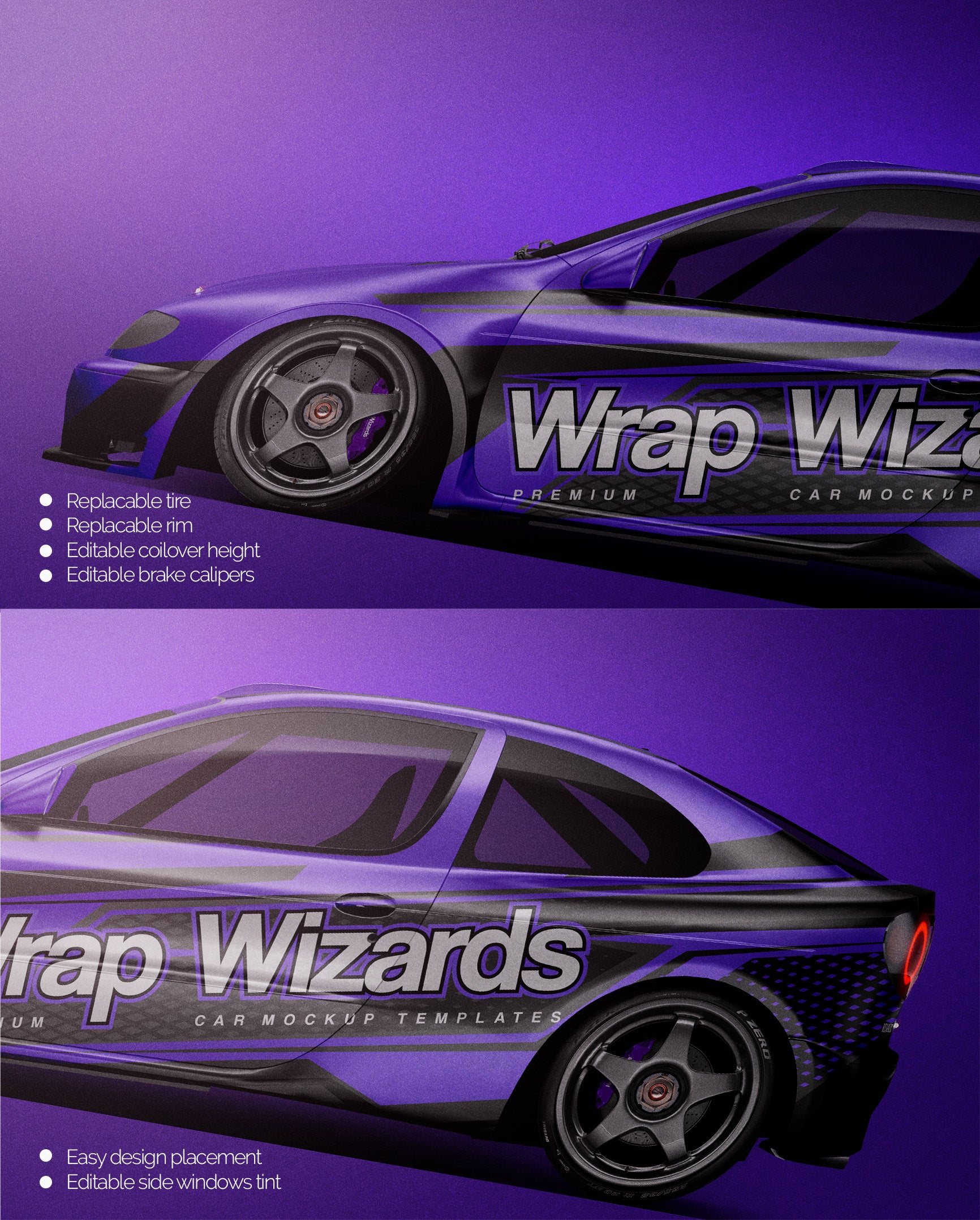 The templates are made on smartly and usefully separated layers to make adding design parts, custom color, placing logos or stickers and doing all adjustments as suspension height or rims change as easy and quick as possible - because we want to improve your job and save your time!