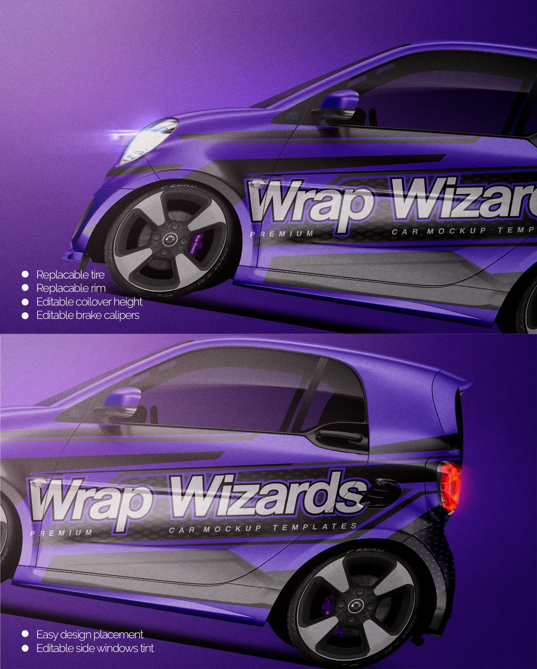 The templates are made on smartly and usefully separated layers to make adding design parts, custom color, placing logos or stickers and doing all adjustments as suspension height or rims change as easy and quick as possible - because we want to improve your job and save your time!