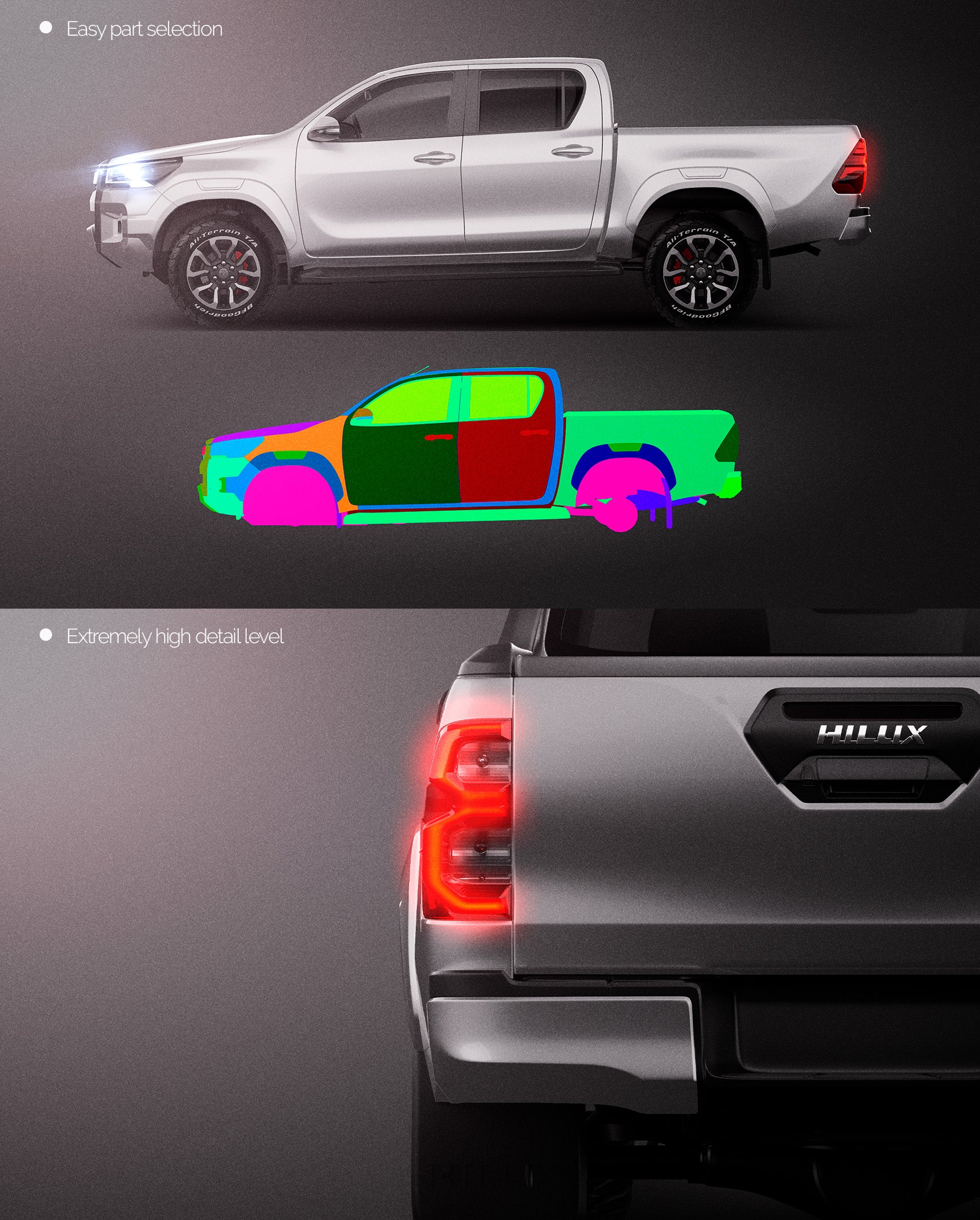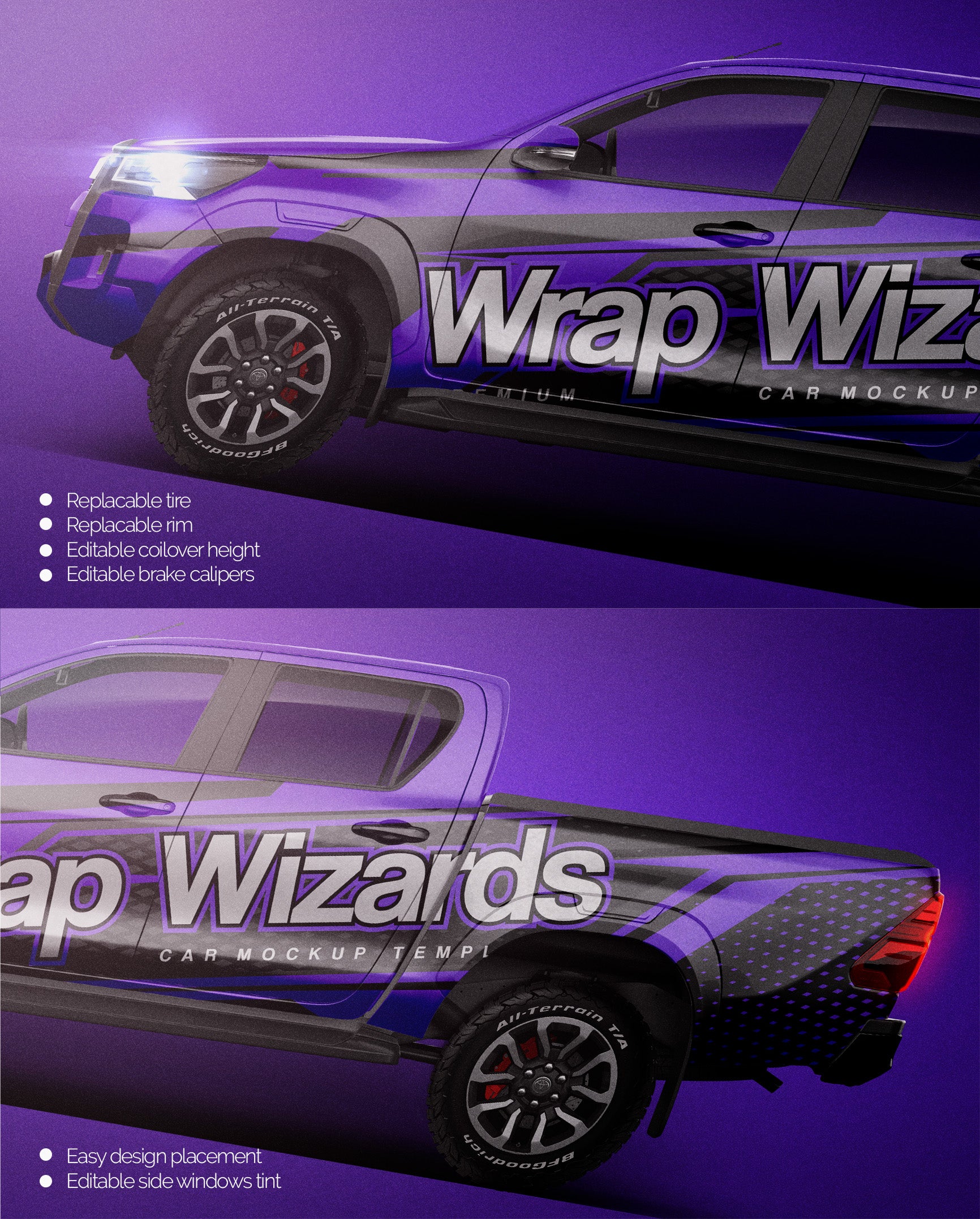 The templates are made on smartly and usefully separated layers to make adding design parts, custom color, placing logos or stickers and doing all adjustments as suspension height or rims change as easy and quick as possible - because we want to improve your job and save your time!